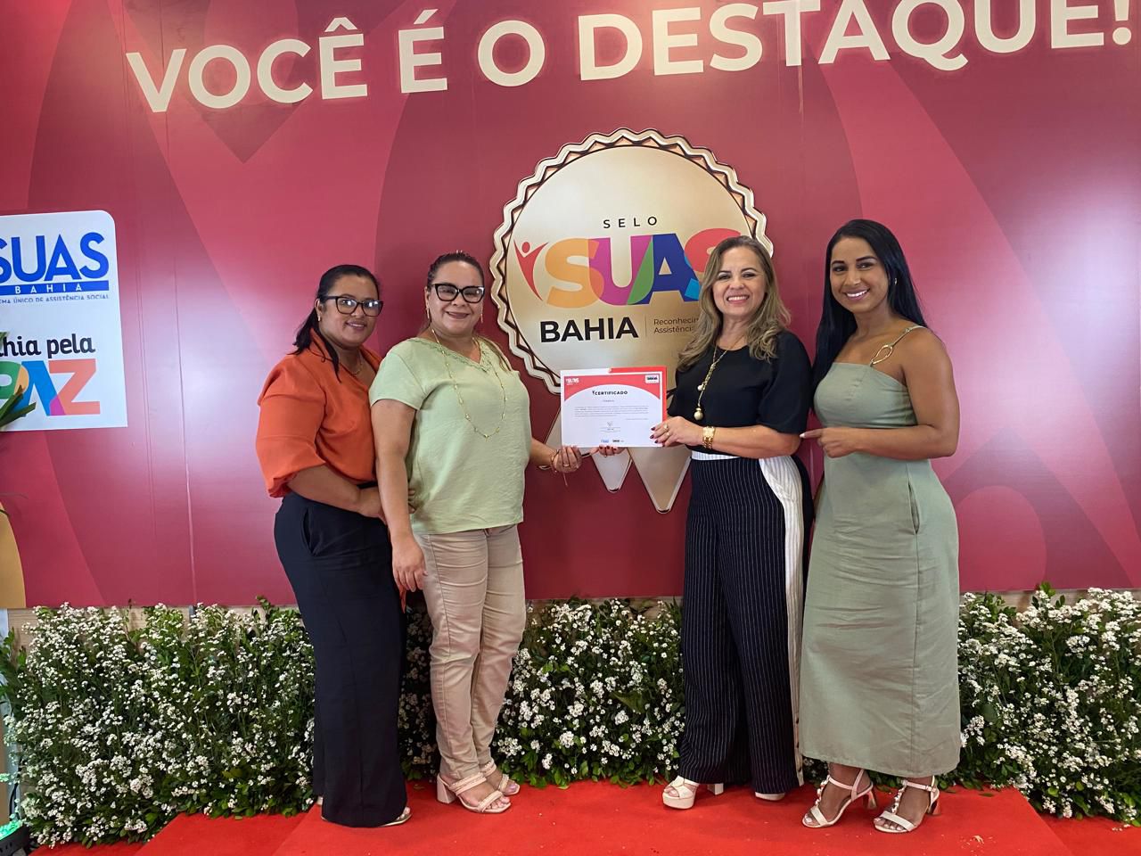 Durante a cerimônia, o município esteve representado pela equipe da Secretaria de Desenvolvimento Social (SEDESTH), formada pela secretária de Assistência Social Maria Vania Costa Santana Ferreira, pela assistente social Luciara de Jesus Souza, pela coordenadora da Proteção Básica Andreya Rodrigues Gonçalves Zorzal e pela coordenadora do Cadastro Único Arielle Souza Santos Colares, que acompanharam a entrega da premiação.