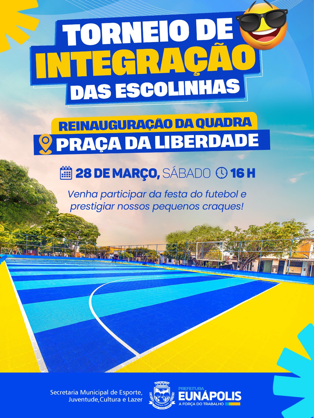 A Prefeitura de Eunápolis realiza, neste sábado (28), a partir das 16h, a reinauguração da quadra da Praça da Liberdade, que passou por uma requalificação completa para melhor atender a comunidade. Para marcar a entrega do espaço, será promovido um torneio de integração das escolinhas de futebol, reunindo atletas infantis e suas famílias em um momento de integração e incentivo ao esporte.